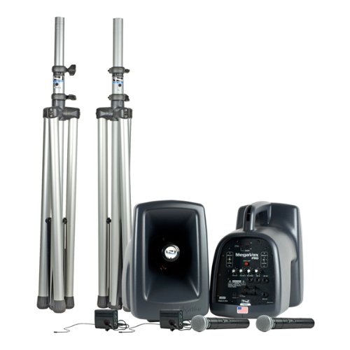 Anchor Audio MEGA-DP DUAL MegaVox Pro Deluxe Package MEGA-6000U2 with 2 wireless receivers. MEGA-6001 companion speaker, SC-50 connection cable, two SS-550 speaker stands, choice of transmitter: WH-6000 handheld or WB-6000 body pack and choice of wireless mic: LM-60 lapel, HBM-TA4F headband, CM-60 Collar, EM-TA4F UltraLite. Specify two microphones.