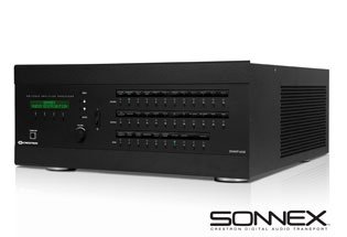 A fully-scalable audio distribution system that delivers high-output audiophile sound quality to every room with significantly reduced cabling, low power consumption, advanced DSP, and integrator-friendly setup. The Sonnex® Multiroom Audio System takes audio distribution to a higher level, facilitating massive systems with up to 74 zones and over 30,000 Watts of power! Employing a whole new system topology, Sonnex minimizes speaker wiring distances by allowing expansion units to be placed central to the rooms they serve. Twenty-four stereo channels of uncompressed digital audio and control are routed to each expander over a single inexpensive shielded CAT5e cable[1]. Gone is all the clutter of amplifier interconnects and input loop-thru cables, meticulously integrating 8 zones of high-performance power amplification and signal processing, plus input switching for a generous 24 analog and digital sources, all in one compact 4-space rack-mountable package.