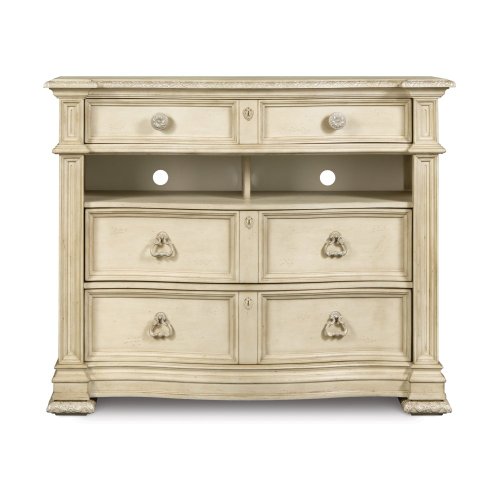 - Media Chest features top open compartment and 3 drawers with the appearance of 6 and wire management in the back